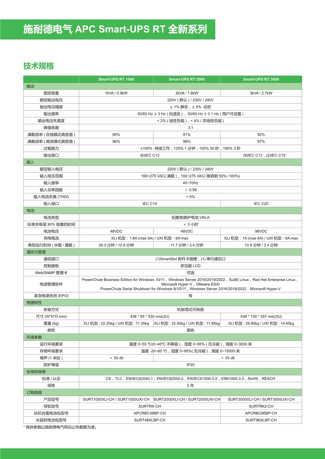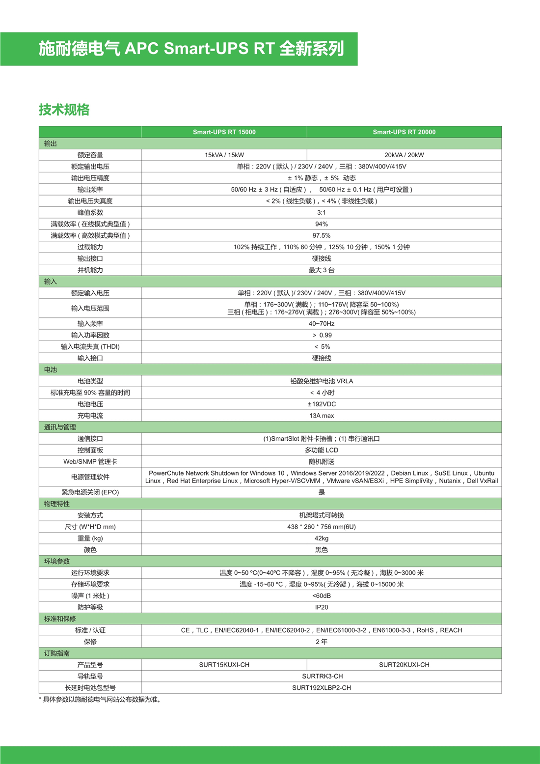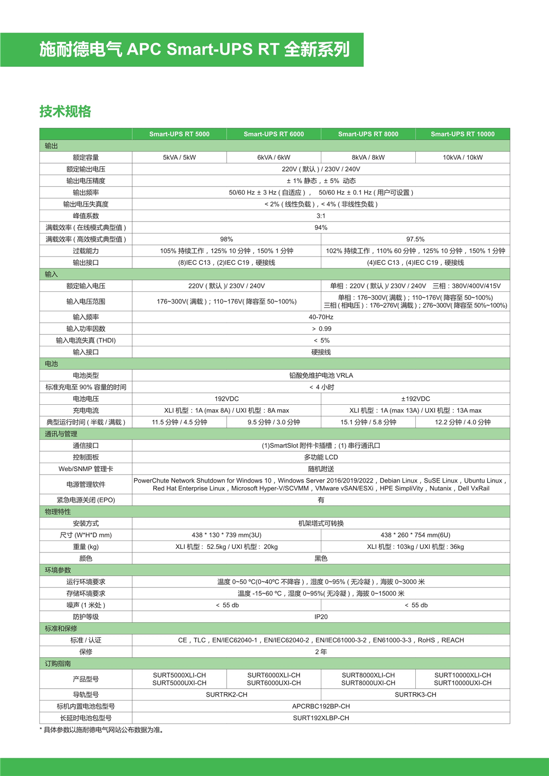 秉承Smart-UPS系列的高品质和高可管理性,Smart-UPS RT全新系列采用双变换在线式结构、塔式和机架式可转换的安装设计,为更广泛的设备提供高可用性电源保护。无论功率大小,全国各地的Smart-UPS用户,均可享受施耐德电气APC的上门服务。