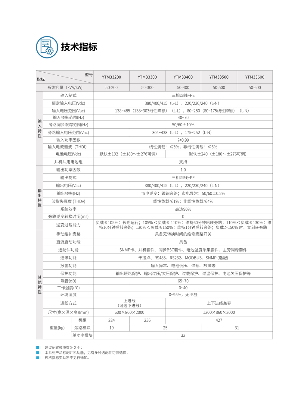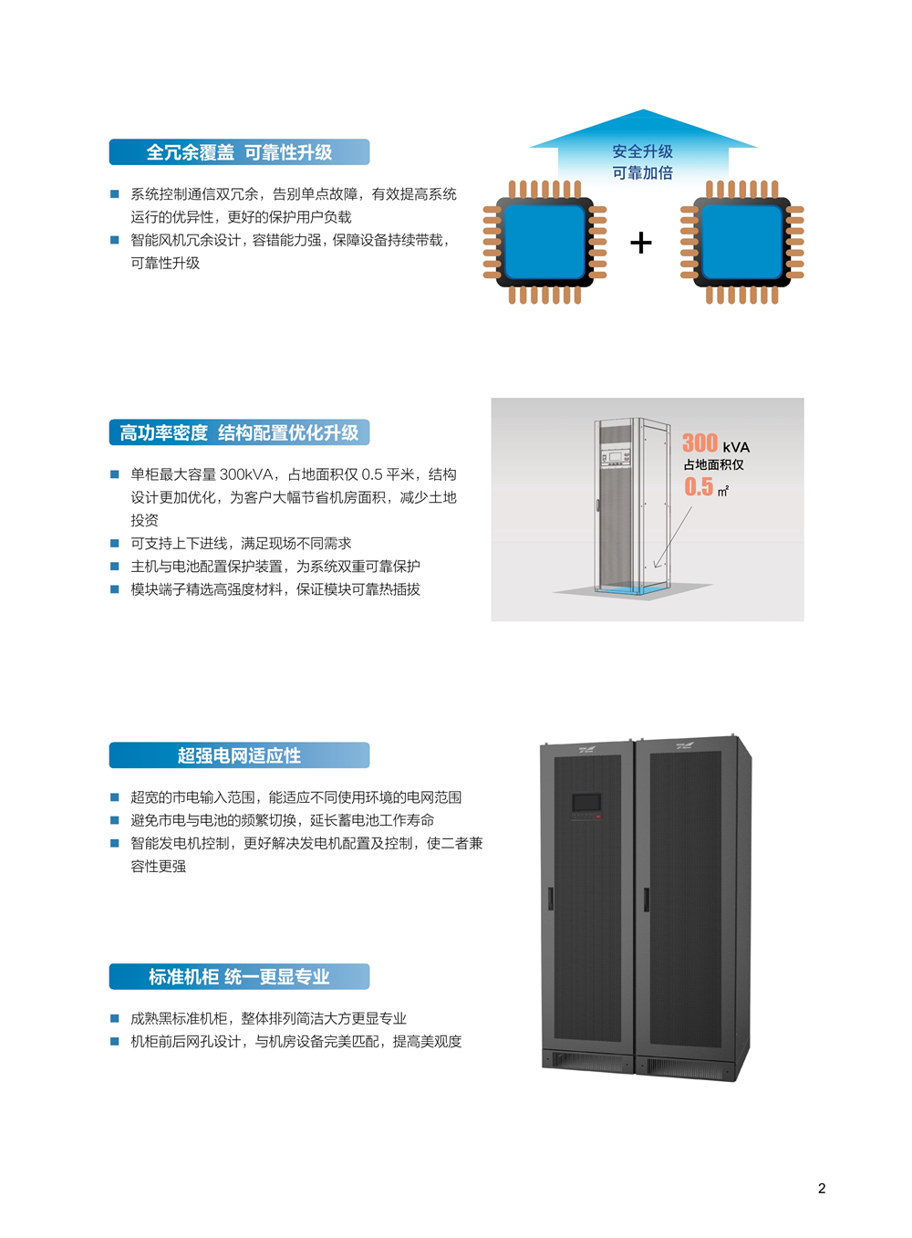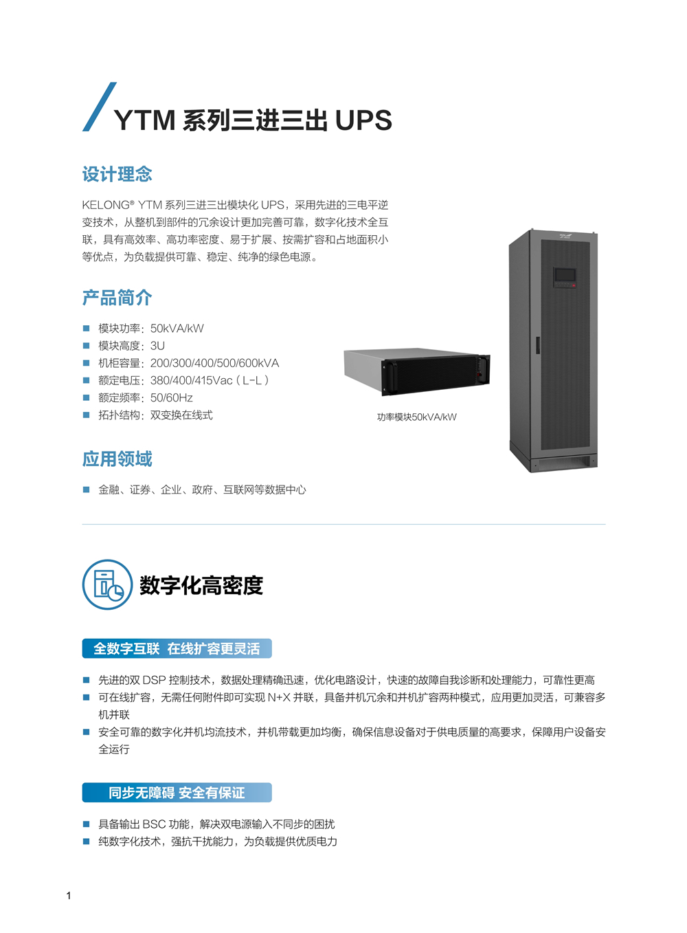 科华® YTM 系列三进三出 UPS@50kW模块,采用先进的三电平逆变技术,从整机到部件的冗余设计更加完善可靠,数字化技术全互联,具有高效率、高功率密度、易于扩展、按需扩容和占地面积小等优点,为负载提供安全、稳定、纯净的绿色电源。