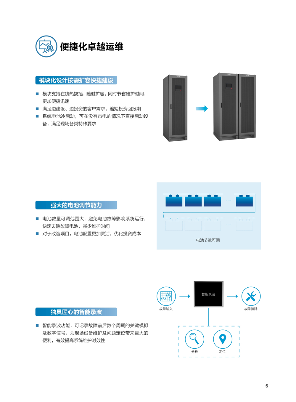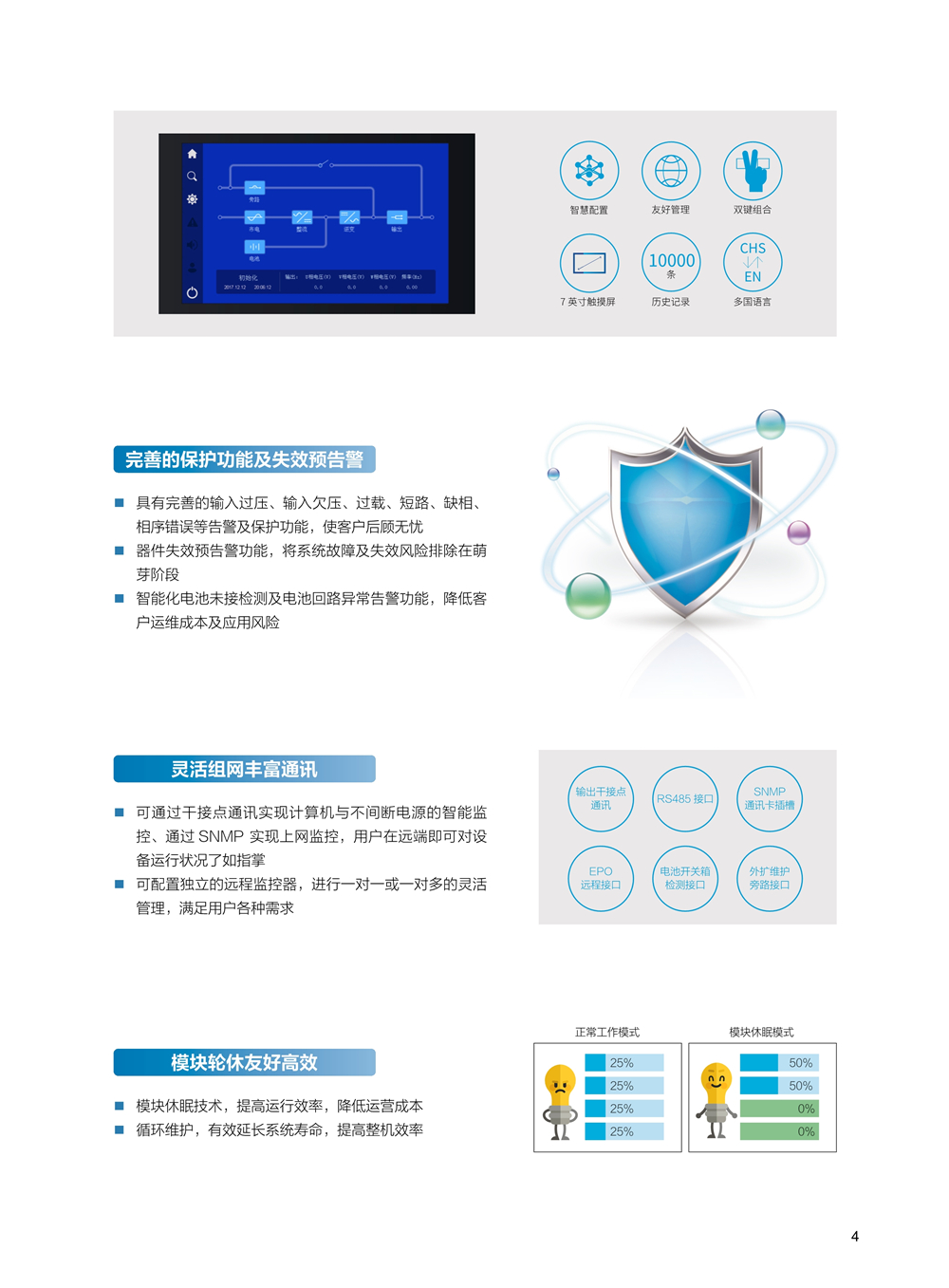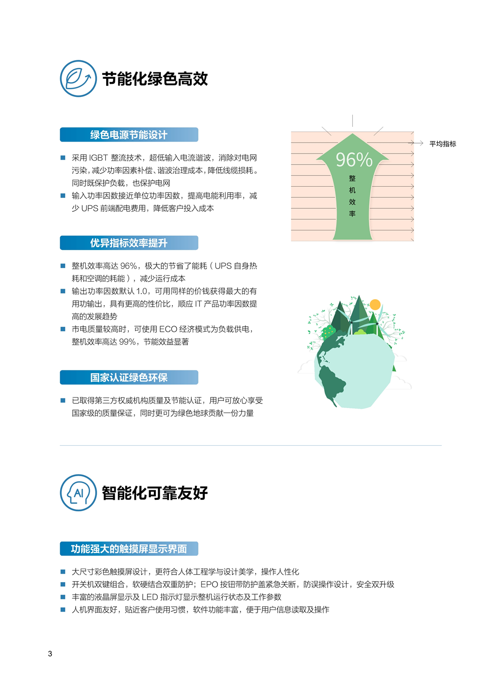 科华® YTM 系列三进三出 UPS@50kW模块,采用先进的三电平逆变技术,从整机到部件的冗余设计更加完善可靠,数字化技术全互联,具有高效率、高功率密度、易于扩展、按需扩容和占地面积小等优点,为负载提供安全、稳定、纯净的绿色电源。