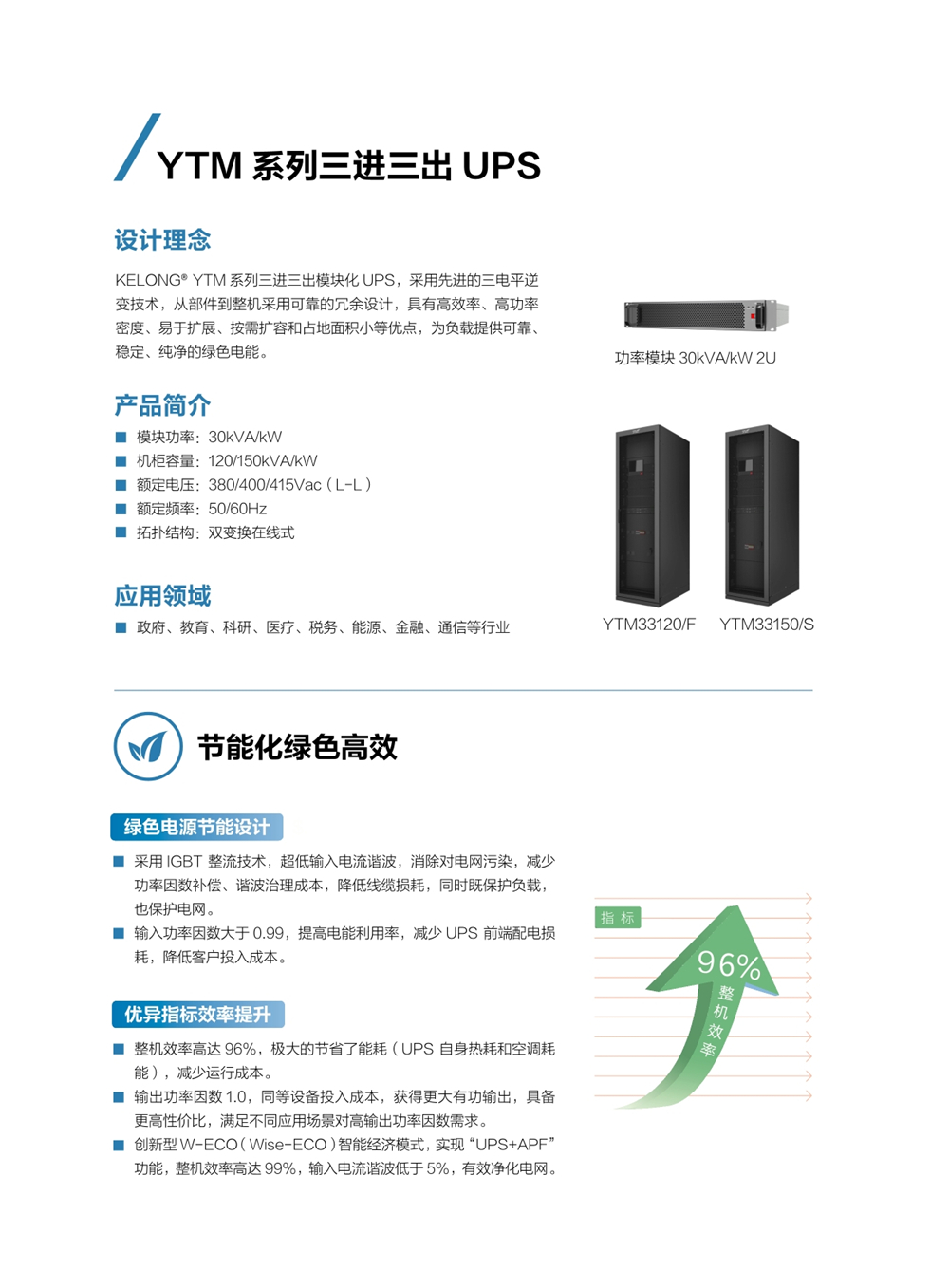 科华® YTM系列三进三出 UPS@30kW 模块,采用三电平逆变技术,从部件到整机采用可靠的冗余设计,具有高效率、高功率密度、易于扩展、按需扩容和占地面积小等优点,为负载提供可靠、稳定、纯净的绿色电能。