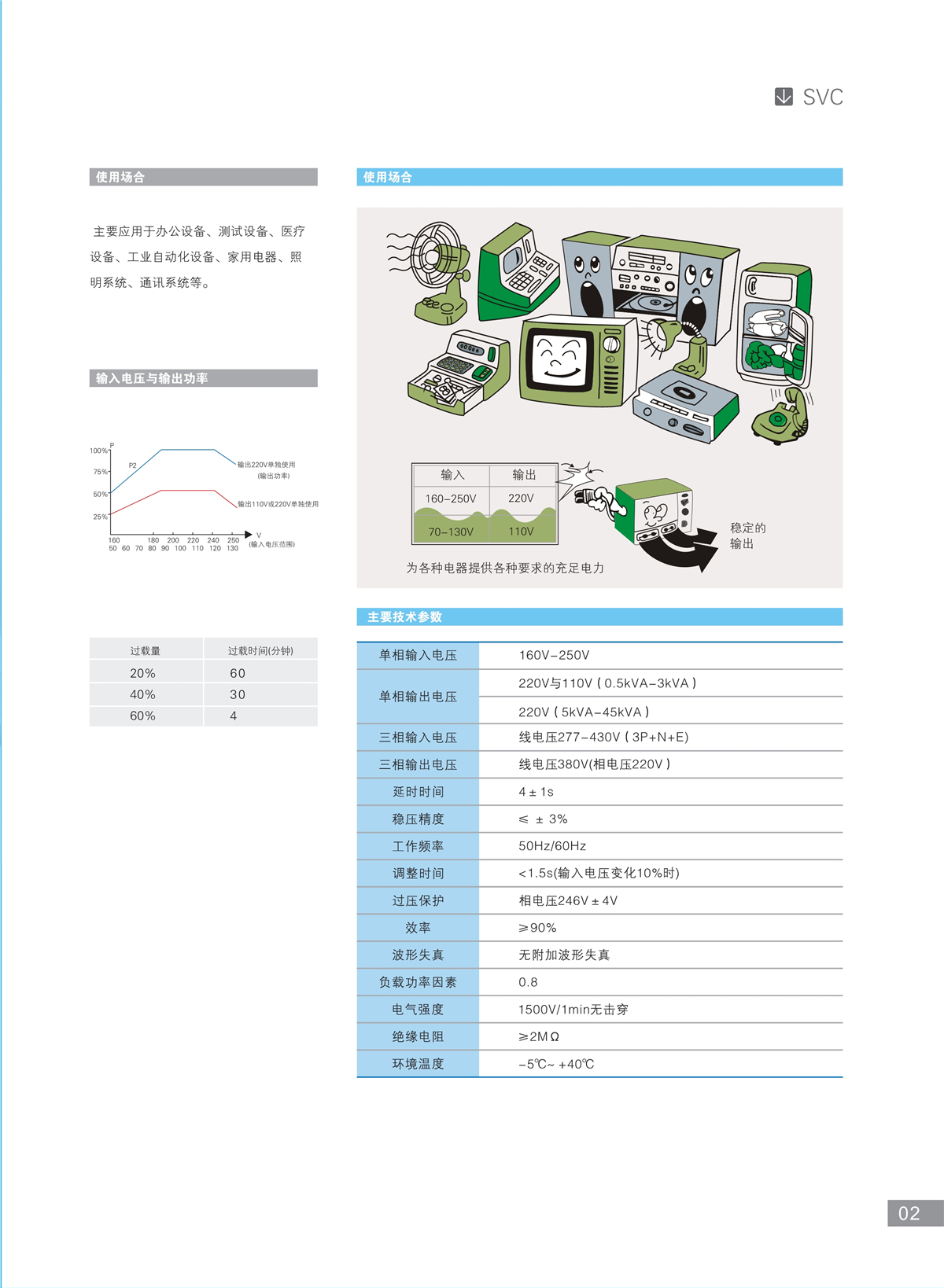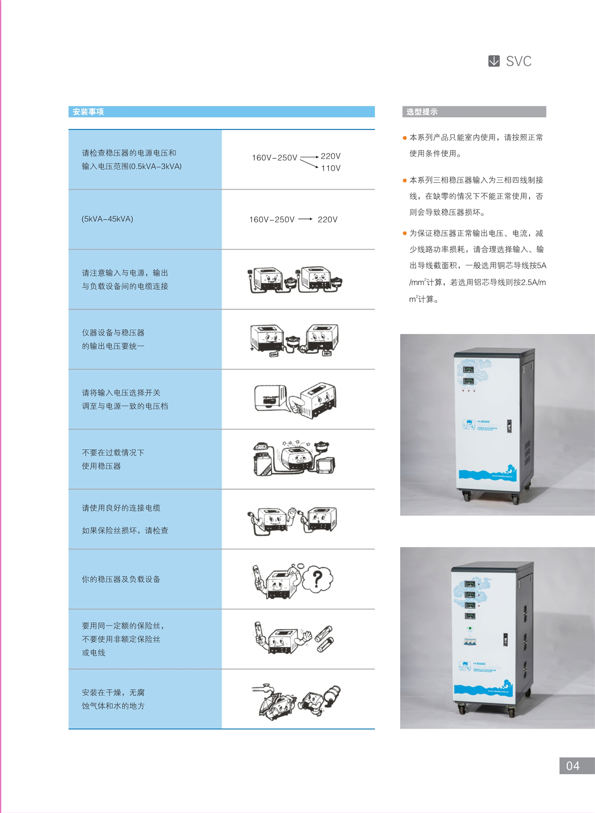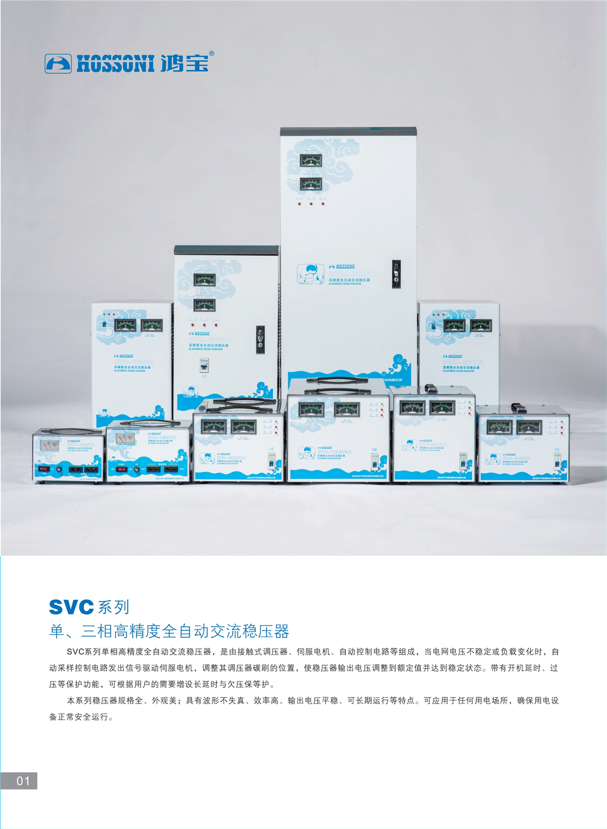 SVC系列高精度全自动交流稳压器,是由接触式调压器、伺服电机、自动控制电路等组成,当电网电压不稳定或负载变化时,自动采样控制电路发出信号驱动伺服电机,调整其调压器碳刷的位置,使稳压器输出电压调整到额定值并达到稳定状态。带有开机延时、过压等保护功能,可根据用户的需要增设长延时与欠压保等护。